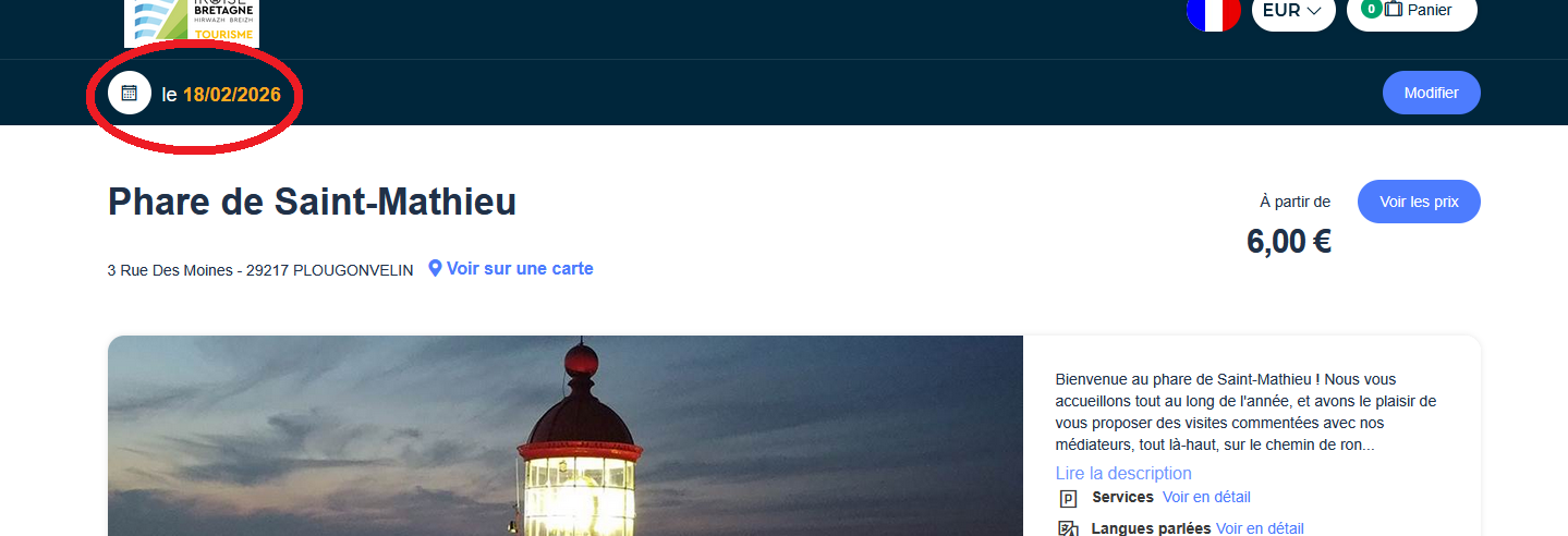 Avant de réserver, faites bien attention à la date sélectionnée. Si ce n’est pas celle que vous souhaitez, cliquer sur celle qui est affichée ou sur le bouton « modifier » sur la droite. Un calendrier va alors s’ouvrir avec les dates disponibles en couleur verte.
